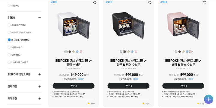 삼성 비스포크 큐브 냉장고 가격대는 60만원대, 수납존의 종류에 따라 가격이 조금씩 차이가 난다. 코스트코에서도 판매 중인데 50만 원 초반대 정도였다. 가족 찬스로 삼성 패밀리넷에서 아주 저렴한 가격대에 구입할 수 있었다. 마침 무슨 행사 중인 모양이었는데, 구입하고 싶었던 하양이는 품절이라 살까 말까 고민하다가 차콜로 결정했다. 구매 결심이 늦었다면 이것도 구입하지 못했을 듯. 금세 품절이 떴다.