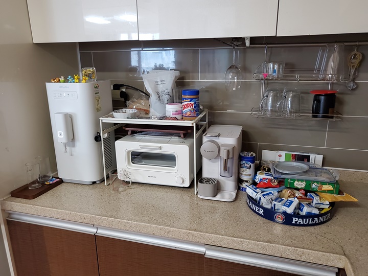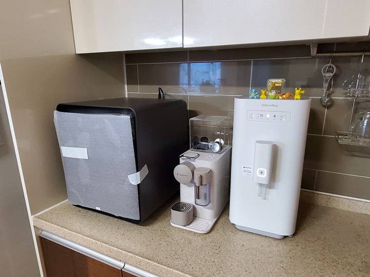 냉장고 옆 쪽으로 큐브냉장고, 정수기, 커피머신, 토스터기를 놓을 생각이었는데.. 자리가 협소하고 네쏘 머신은 전선이 몹시 짧은 관계로 ㅠㅠ 이사 가기 전까지 토스터기는 식탁 위로 가야 했고, 당분간 큐브냉장고-커피머신-정수기 순서로 자리 잡아야 했다.