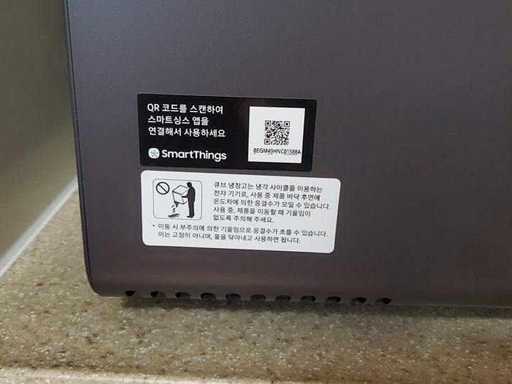 냉장고 본체 옆면의 QR코드 스캔해서 스마트싱스 앱에 연결해도 되고, 스마트폰에서 SmartThings 앱 설치/실행한 다음 기기 추가 버튼을 눌러 제품 목록에서 큐브 냉장고를 선택하면 된다.