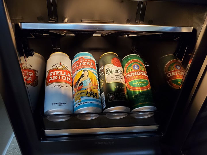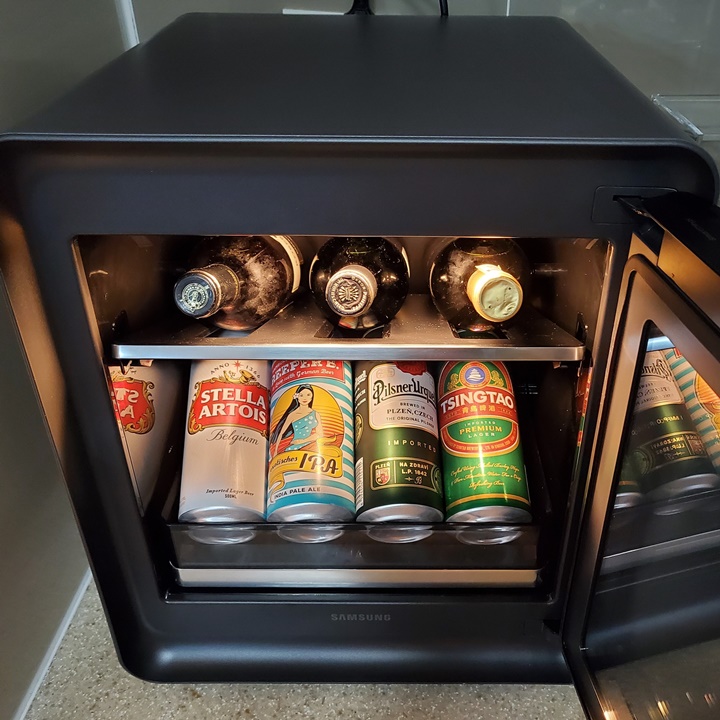 삼성 비스포크 큐브 냉장고 온도 설정은 5~18℃까지 가능하다. 더 차갑게 보관하고 싶은 경우엔 일반 냉장고에 보관~ 보관 내용물 별 적정온도는 SmartThings 연결하면 쉽게 확인 가능하다. (5~7℃ 필스너/라거 5~8℃ 스파클링 와인 7~10℃ IPA/스타우트 9~13℃ 화이트 와인 10~12℃ 화이트 에일/바이젠 10~13℃ 로제 와인 11~14℃ 에일 12~18℃ 레드와인)