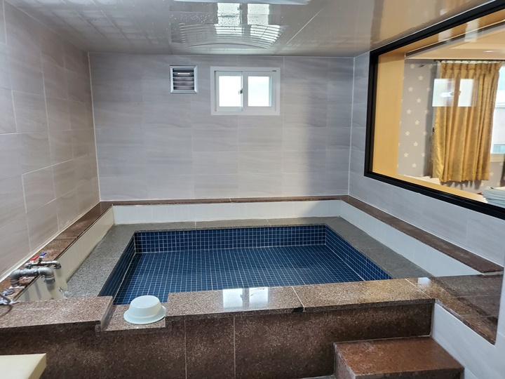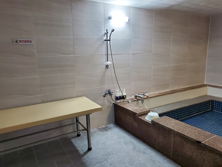 리모델링을 한지 얼마 안되어서 욕실은 깔끔하고 청소상태도 양호했다. 변기, 세면대, 세신 베드, 욕조가 한 공간에 있는 구조는 아쉽지는 변기랑 욕조 거리가 멀기 때문에 그리 거북하지는 않다. 샴푸, 컨디셔너, 바디워시 비치되어 있으며 샤워기, 바가지도 있다. 대야랑 목욕탕 의자는 없었음~