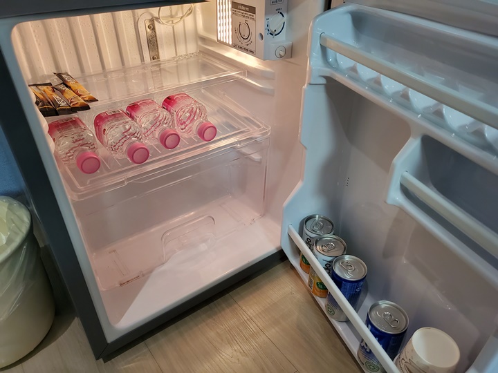욕실로 들어가는 문 옆으로 벽걸이 TV와 냉장고가 있다. 냉장고에는 생수랑 음료수, 커피 정도가 들어있는데 목욕하다 보면 배가 고플 수 있으니 간단히 먹을 간식 챙겨 오면 좋다. 전기포트도 있어서 라면 같은 것도 끓여 먹을 수 있음~