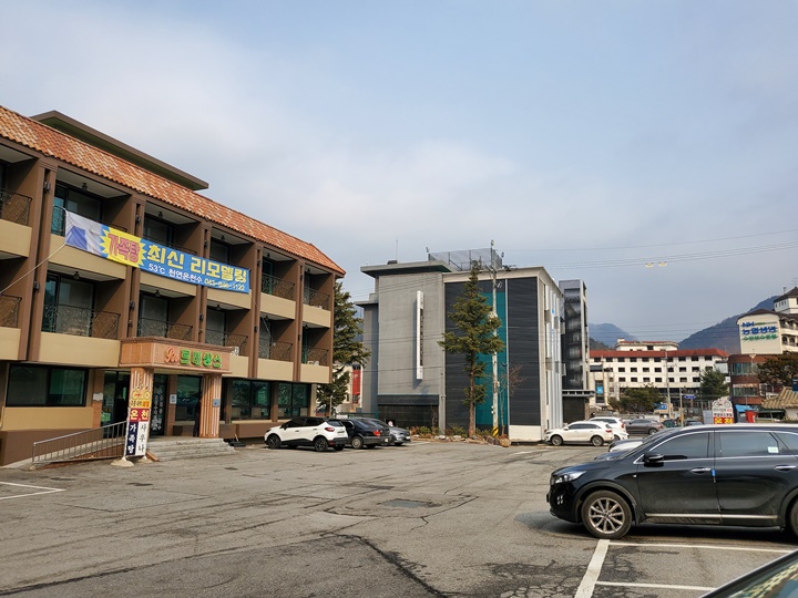 수안보온천지구를 관통해서 흐르는 석문동천 기준 아래쪽에 위치한 르네상스 호텔, 예상했던 것보다 규모가 컸고 3층 건물이 꽤나 길었다. 주차장도 넉넉한 편~