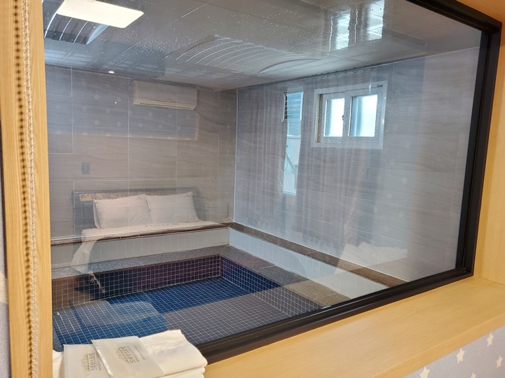 가족탕이 큼직하므로 아이들 물놀이 하게 하고 침대에서 바라볼 수 있게끔 유리창이 되어 있어서 편하다. 바라보는 시선이 부담스럽다면 블라인드로 가릴 수 있게 블라인드도 설치되어 있다.