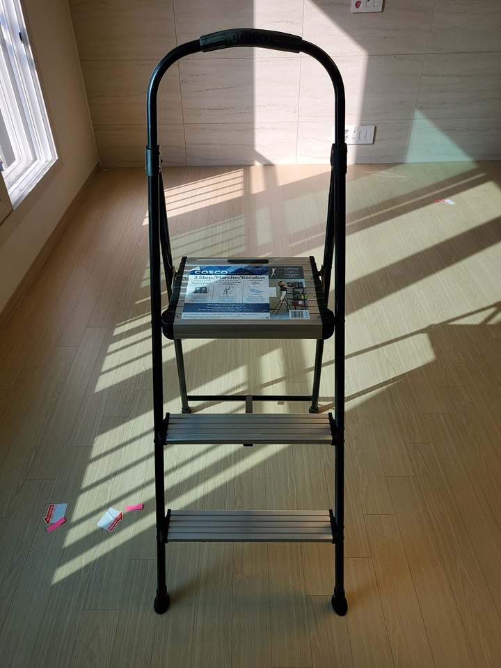 발판이 넓은 편이고, 높이도 다른 접이식 사다리에 비해서 높아서 키가 크지 않은 성인 여성이 높은 곳에 위치한 물건을 이동하거나 살펴보기에도 편하다. 실제로 점검 시 다른 사다리 가져온 분들도 오며 가며 많이 보게 되었는데, 코스트코 3단 사다리가 확실히 크더라는 ㅎㅎㅎ 사다리 가지고 이동시에는 어깨에 상단 손잡이 부분을 걸고 다니면 된다.
