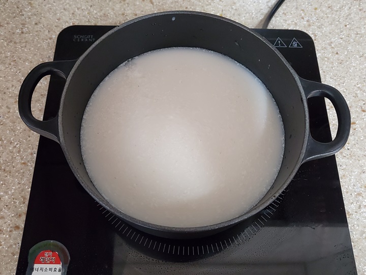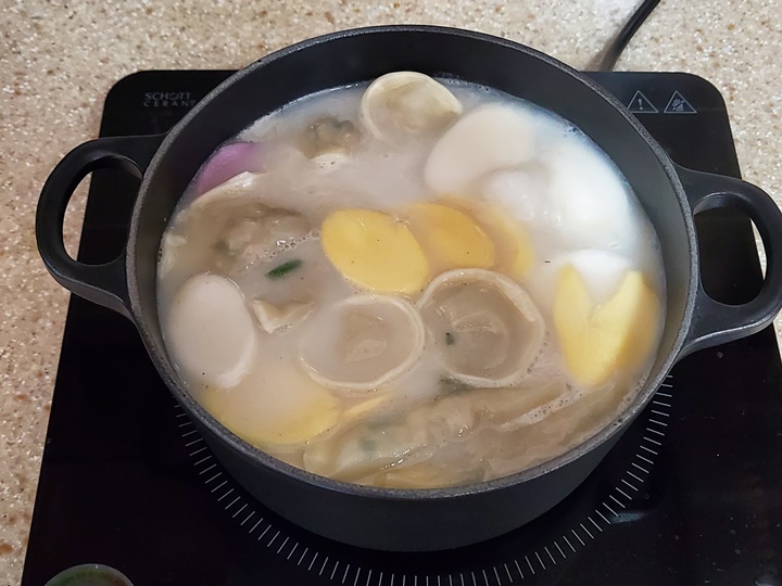 떡만둣국 끓이기 냄비에 사골육수와 물 450g, 멸치 농축 육수를 넣고 끓인다. 국물이 끓기 시작하면 만두를 넣고, 5분간 중불에서 끓여준다. 떡국 떡을 넣고 5분 더 끓여준다.