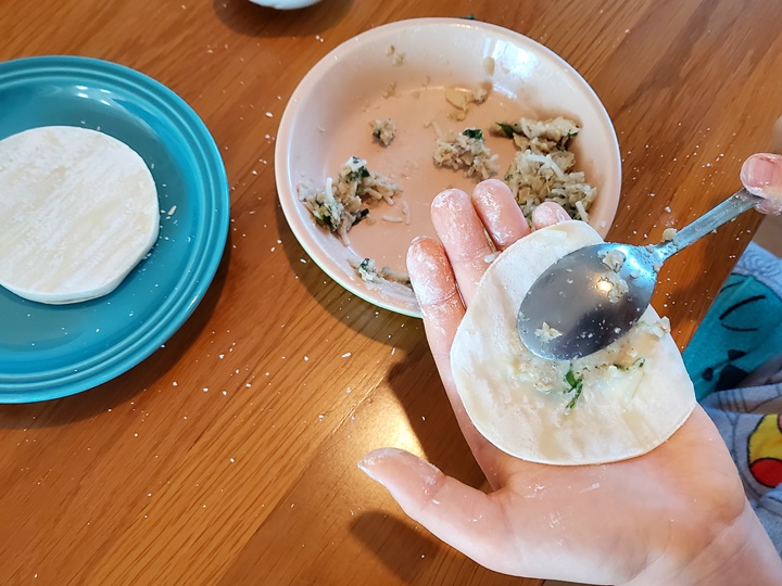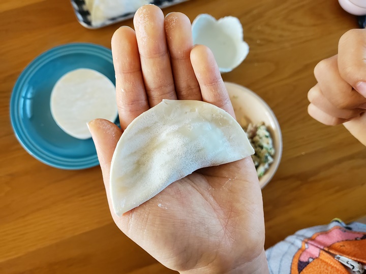 만두 만들기 만두피에 고기소 한 티스푼 (약 8g)을 넣고 만두피 테두리에 물을 묻힌 후 접어서 예쁜 모양으로 만든다.