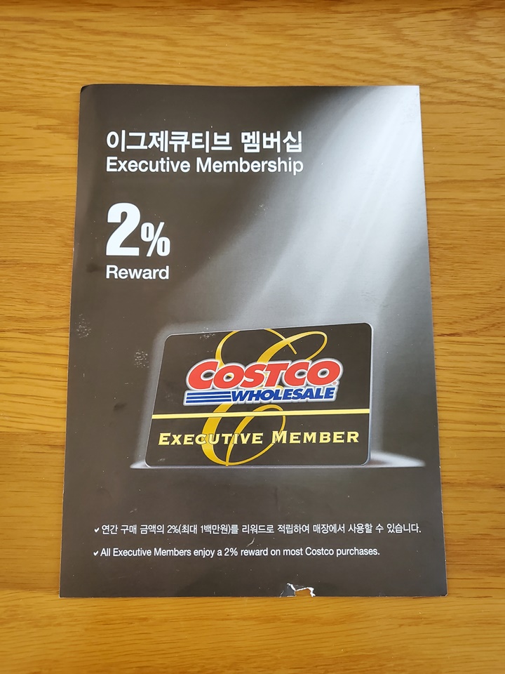 이그제큐티브 멤버십은 코스트코의 프리미엄 회원권으로 구매금액의 2%를 리워드 적립 가능하며 연간 최대 100만 원까지 적립할 수 있다.