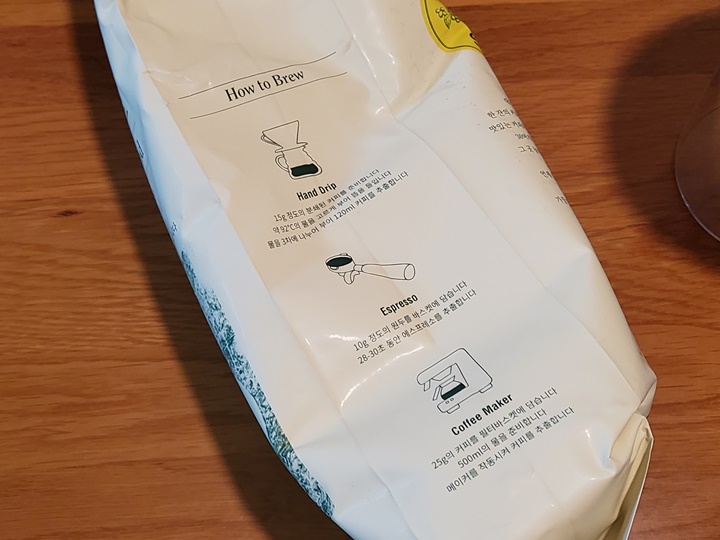 봉투 측면에 추출방법도 소개되어 있는데 핸드드립의 경우 15g 정도의 분쇄된 커피를 준비하여 약 92℃의 물을 고르게 부어 뜸을 들인 후 3차에 나누어 물을 붓고 120ml의 커피를 추출하면 된다고~