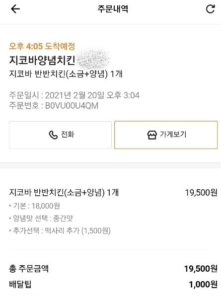 아이도 함께 먹을 거라서 소금구이 + 숯불양념치킨 구성의 지코바 반반치킨 (18,000원)을 주문했다. 떡사리 추가 (1,500원)하고 배달팁 1,000원까지 총 20,500원을 결제했다.