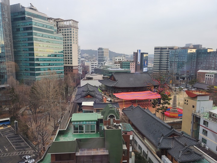 신라스테이 광화문 1206호 전망은 이렇게 근처 빌딩뷰~~ 조계사 전망이면 좋았을 텐데... 오른쪽 사진은 다음날 조식 먹으러 가서 조식당에서 찍은 조계사 뷰 사진이다.