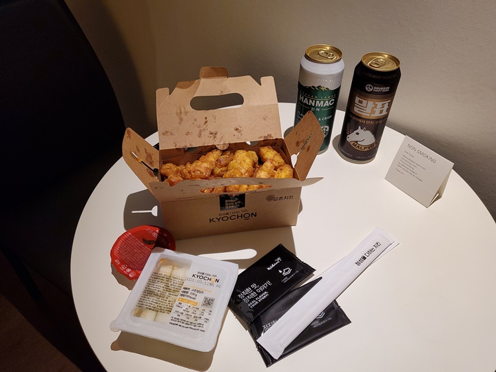 그래서 근처 수제 맥주집에 가볼까도 했는데, 당분간 일요일은 휴무인 곳이 너무 많아서... 어쩔 수 없이 교촌치킨에서 허니 순살을 포장해왔다. 편의점에서 캔 맥주도 몇 캔 구입하고~ 호텔에 돌아와서 보니 1층에 라이더분들 엄청 많이 계셨던 것! 우리도 배달의 민족으로 주문하면 되었을 것을 괜히 발품만 팔았다 ^^ㅋ (호텔까지 음식 배달은 가능하지만, 픽업은 1층에서 해야 함)