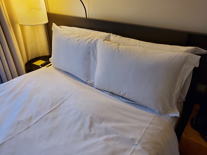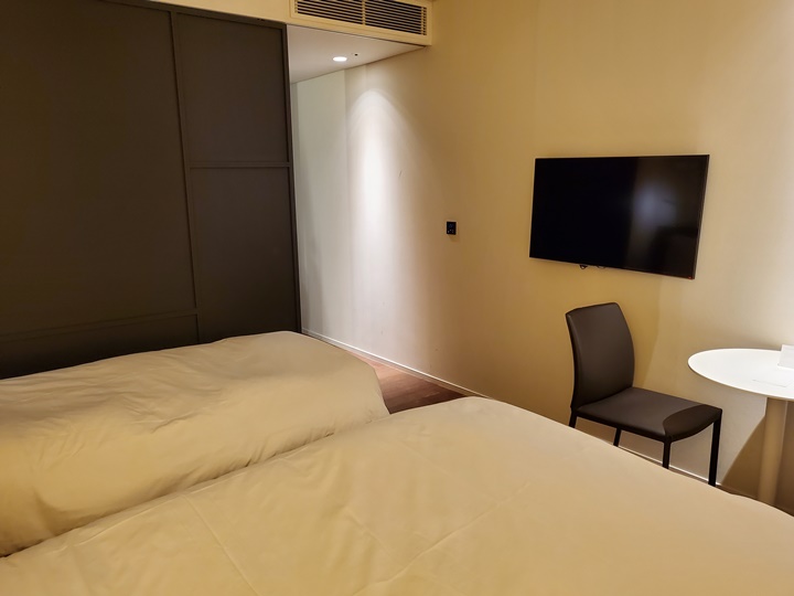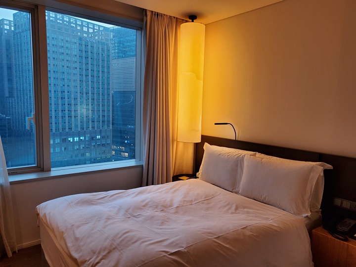 깔끔하게 정돈된 침구는 고급 매트리스(어디껀지는 모르겠다), 거위털 이불, 오리털 베개, 40인치 삼성 LED TV, 미니 테이블 등이 있다. 객실 크기가 큰 곳을 선호한다면 약간 답답하게 느껴질 수는 있을 듯~