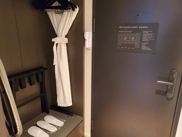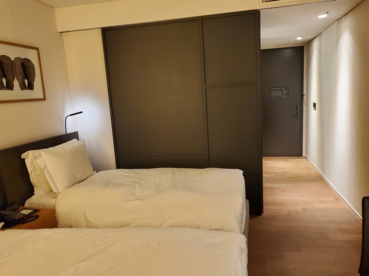 패밀리 트윈룸 객실 에 들어서자마자 정면에 바로 보이는 것은 탁자요 객실 문을 등지고 섰을 때 옆으로는 옷장이 있다. 3인 숙박이라 슬리퍼, 덴탈 키트, 생수 등은 3개씩 준비되어 있는데 샤워가운은 2인용뿐이다. 사용하지는 않았지만, 그냥 그렇다고 ^^ㅋ 옷장문을 열고 닫으면, 욕실 문이 닫고 열린다. 문 하나를 쉐어한다.
