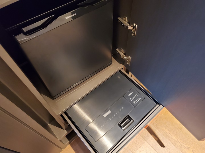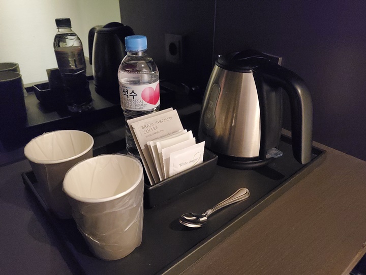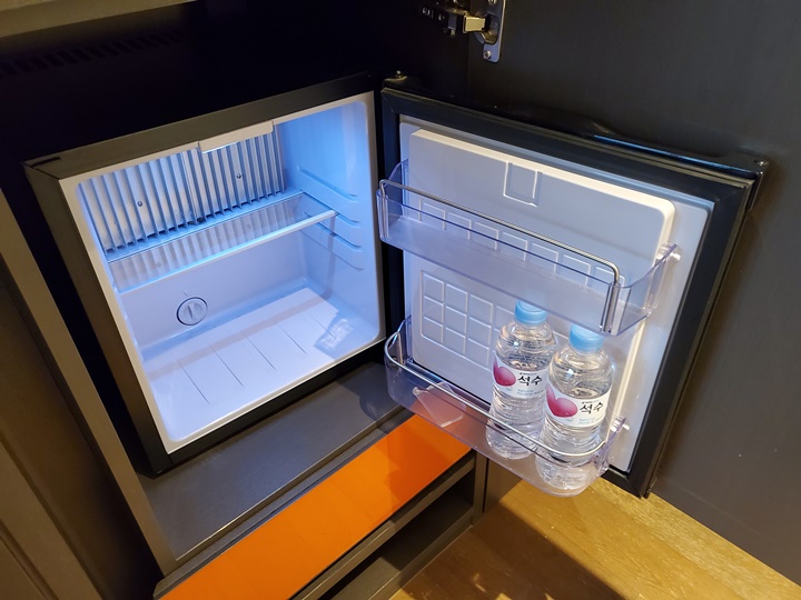 전기포트, 간단한 차류, 미니 냉장고가 있고, 냉장고 아래로는 금고도 서랍형으로 숨겨져 있다. 생수는 2병 제공이라고 되어 있는데 3인 숙박이라 하나 더 놔둔 것인지... 어떤 건지는 잘 모르겠다. 여튼 500ML짜리 석수 3병이 있었다.