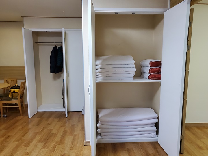 큰 방에만 싱글베드 2대가 있고 침구상태는 깔끔하지만 침대 매트리스는 불편하다. 나는 바닥에 이불 깔고 자는 걸 선택했다;;;