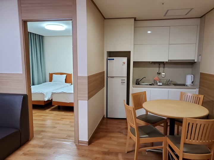 냄새가 심하게 나는 음식은 조리하지 말라고 안내되어 있지만, 간단히 식사준비할 수 있는 조리도구를 갖추고 있다. 전기밥솥, 전기레인지, 전기포트, 싱크대, 그릇 등등... 냉장고도 큰 편이라 이것저것 넣어도 넉넉하다. 하지만, 이거 소음이 있는 편이라 거슬릴 수도 있을 듯...