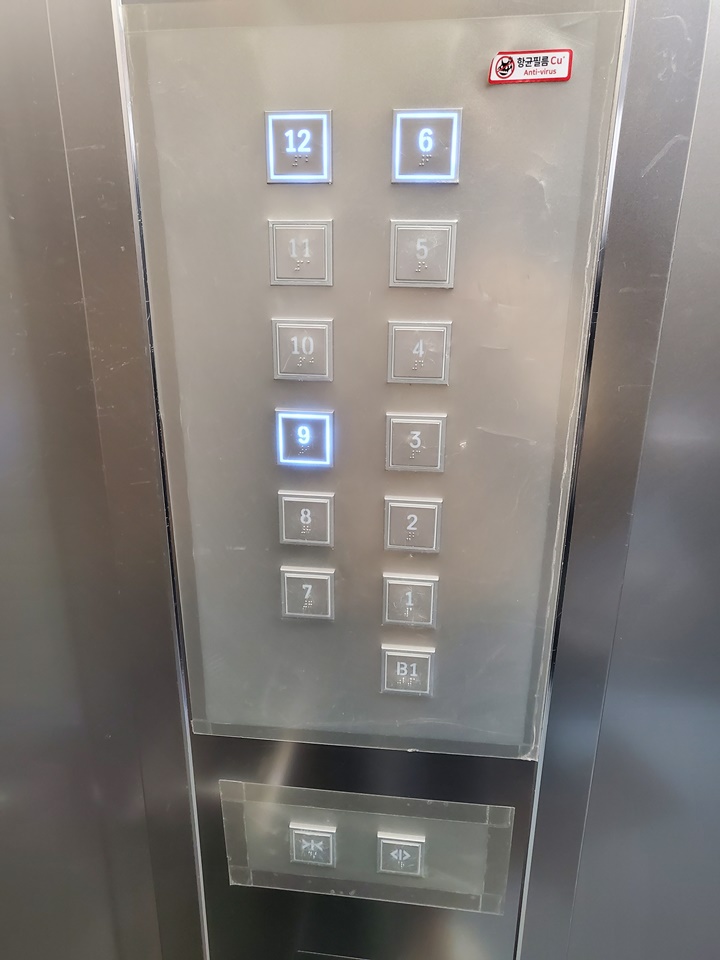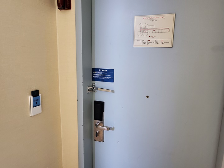 배정받은 블루동 12층으로 올라갔다. 복도에서부터 오래된 느낌이 든다. 아마도 1200~1204호는 로얄이나 로얄스위트일 것 같다. 문은 철문으로 튼튼하지만 객실 안에서의 제법 큰 목소리는 복도에서 고스란히 들리니 대화 시 조심해야 할 것 같았다.