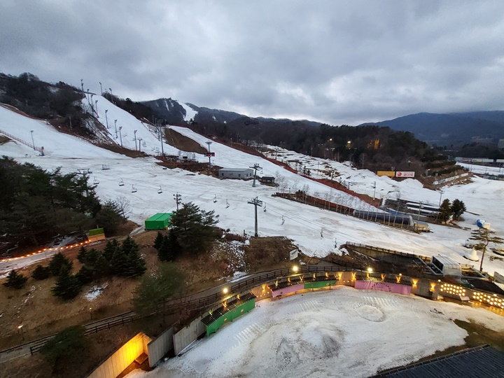 금요일에는 비가 약간 내려서 하늘이 흐렸지만, 다음날 아침엔 날씨가 꽤 좋았다. 한겨울이었다면 스키장 설경이 더욱 아름다웠을 것 같다.