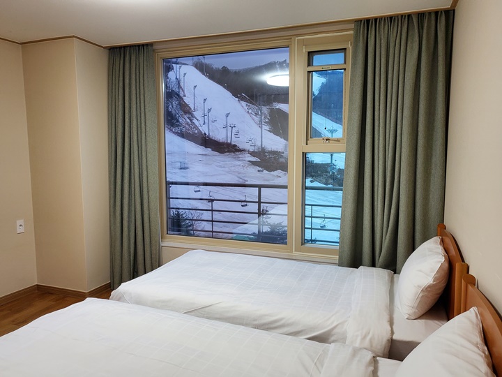 5인 기준실이라 침구는 3채 더 준비되어 있다. (침대2+이불3) 작은방에는 침대는 없지만 큰 창문이 있어서 전망이 좋다. 스키장 사진 액자 해둔 거 같은 기분이 드는 객실이었다.