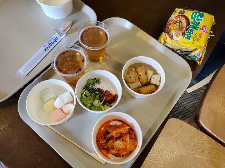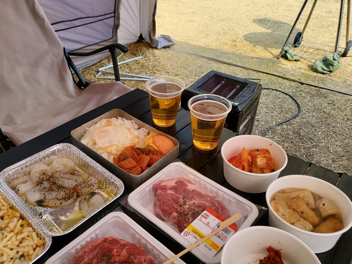 청기단에서 버스 하차하자마자 직원분이 예약자 1인만 안으로 들어오라고 한다. 여기에서 캠핑 비용 결제는 물론이고 생맥주, 라면을 끓여갈 수 있는 준비공간이다. 여럿이 동시 입장하면 혼잡하니 한 명만 들어오라고 하는 듯. 3인 가족이지만 2인 주문하여 아이와 셋이서 먹을 수 있기 때문에 가격 면에서도 그리 부담스럽지 않았다.