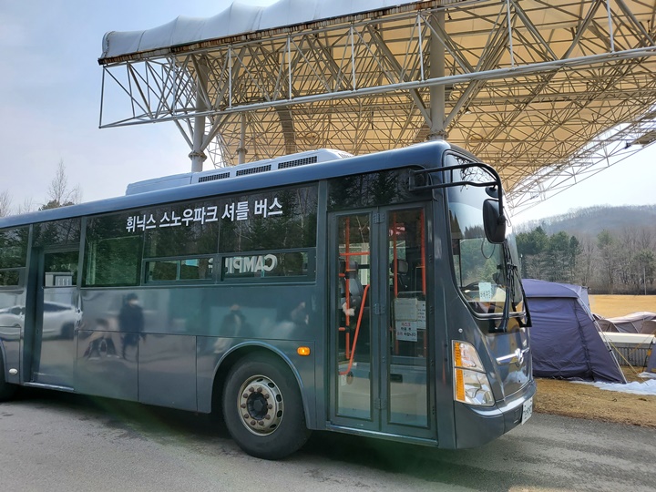 포레스트 캠핑장은 숙소에서 아주 멀지는 않지만 걸어서 가기엔 무리? 우리는 셔틀버스를 타고 블루동에서 청기단까지 이동을 했는데 자차로 오시는 분들도 적지 않은 것 같다. 우리는 무제한 맥주의 혜택을 누리고 싶어서 셔틀버스를 이용했다. 셔틀버스는 평창 휘닉스파크 블루동에서 청기단 캠핑장까지 운행한다.