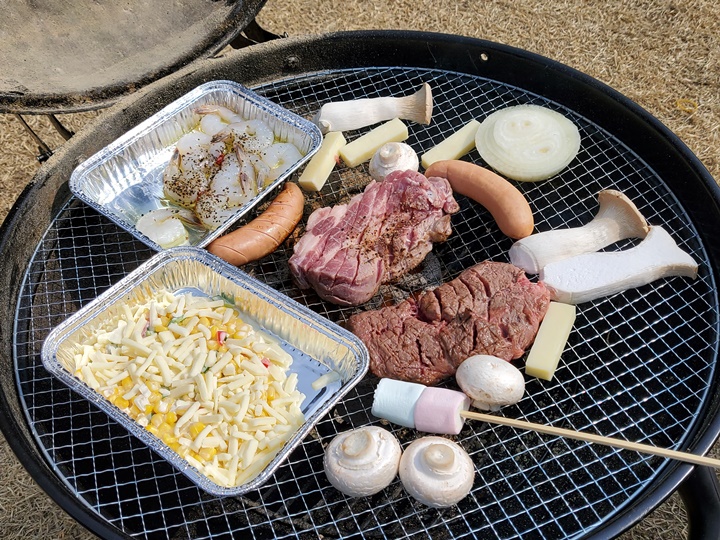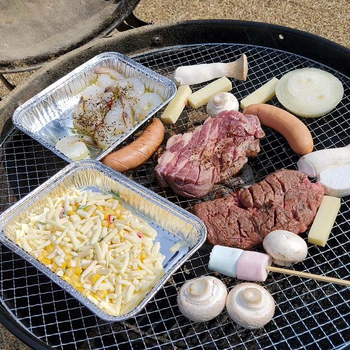 평창 휘닉스파크 홈페이지에 나온 정보로는 2인 기준 구성 메뉴가 소고기 안심(150g), 꽃등심(150g), 돼지 목살(200g), 돼지 양념 쪽갈비, 대하, 소시지, 꼬치어묵, 사이드 메뉴 (구이용 치즈&채소, 추억의 도시락, 가래떡, 김치, 고추냉이, 피클, 명이 나물, 쌈장 등)로 되어 있다. 구성은 조금 바뀐 듯, 고기 구성이 다르고 대하 대신 감바스가 들어가는 등...