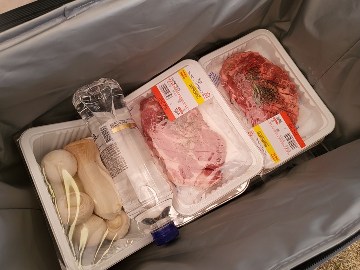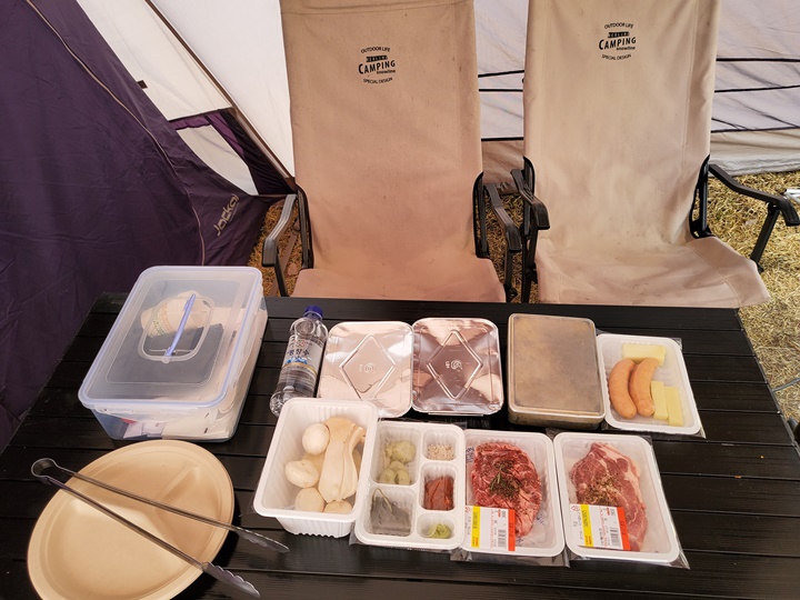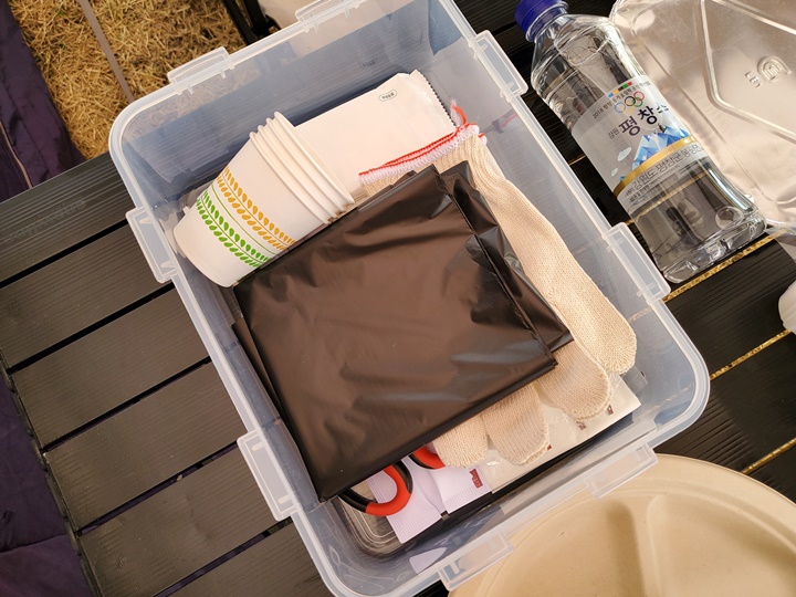 테이블 위에 놓여 있는 보냉 가방에는 일용할 고기와 채소, 생수 등이 들어 있고 그 옆에 있는 락앤락 통에는 종이컵, 물티슈, 비닐봉지 등 일회용품과 가위 등이 준비되어 있다. 캠핑은 가고 싶은데 캠핑용품 다 구입하기 부담스럽고, 관리하는 것도 힘들 것 같은 분들이 좋아할 장소라는 생각이 뿜 뿜 :D