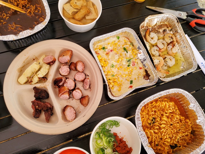 우리 가족의 실수 포레스트 캠핑 BBQ 결제하면서 보니 라면 냄새가 너무 좋다며 고기도 굽기 전에 라면부터 끓인 것? 라면 종류가 너구리, 삼양라면, 참깨라면, 신라면, 짜파게티, 진라면, 김치라면, 사리곰탕, 스낵면, 오징어 짬뽕 등으로 정말 다양하고 금세 끓일 수 있다. 김치, 파, 어묵, 마쉬멜로우 등도 준비되어 있어서 양껏 가져다 먹을 수 있으며 생맥주는 무제한~