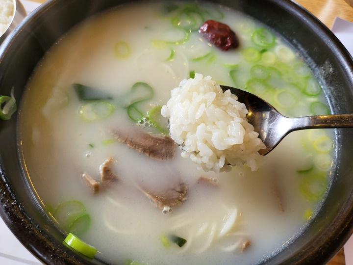 뽀얀 국물에 고기 양이 넉넉하다. 공깃밥이 함께 제공되지만 소면사리도 나오기 때문에, 셋이서 공기밥 두개로 나눠 먹어도 될 정도였다. 여기 밥도 맛있게 느껴졌는데, 여주쌀인건가.. 잘 모르겠다 ^^;;; 확실한 것은 가마솥밥을 주문했다면 더욱 맛있었을 듯! (가마솥밥 변경시 +2,000원)