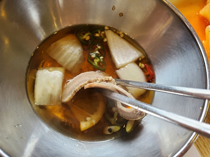 무김치, 배추김치 항아리아 담아 제공되며 먹을만큼 덜어서 먹으면 된다. 특히 무김치는 매우 엄청 굿굿의 맛이라 항아리 2개를 먹어왔다;;;;