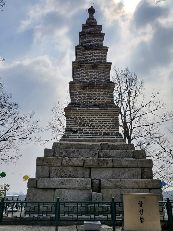 여주 신륵사 다층전탑 보물 제226호 여주 신륵사 다층전탑은 아래로 한강이 보이고 멀리 평야를 마주하고 있는 바위 위에 세워져 있다. 전탑이란 흙으로 구운 벽돌로 쌓은 탑을 이르며, 우리나라에서는 경기도와 경상북도 안동 지역에 몇 기가 남아 있다. 이 탑은 2단으로 기단을 쌓고, 다시 3단의 계단을 쌓은 후 여러 층의 탑신을 쌓아 올린 탑이다. 기단과 계단은 화강암으로 만들어져 있으며, 탑신부는 흙벽돌로 6층까지 쌓아 올렸는데, 그 위에 다시 몸돌 하나가 올라가 있어 7층으로 보이기도 한다.