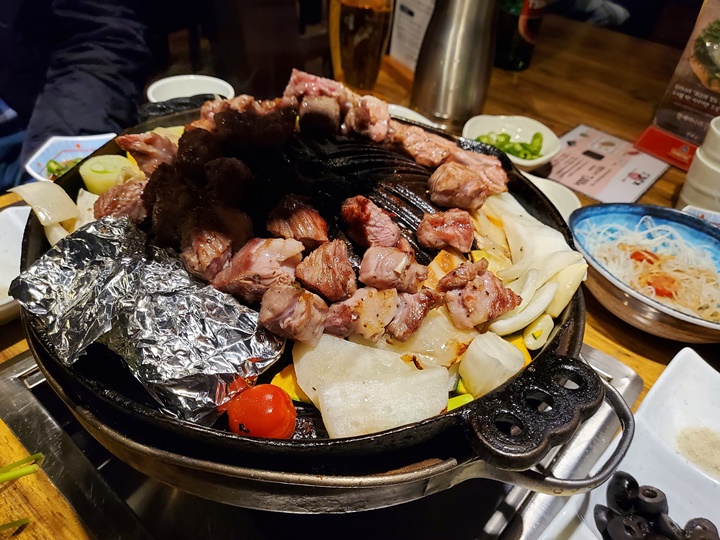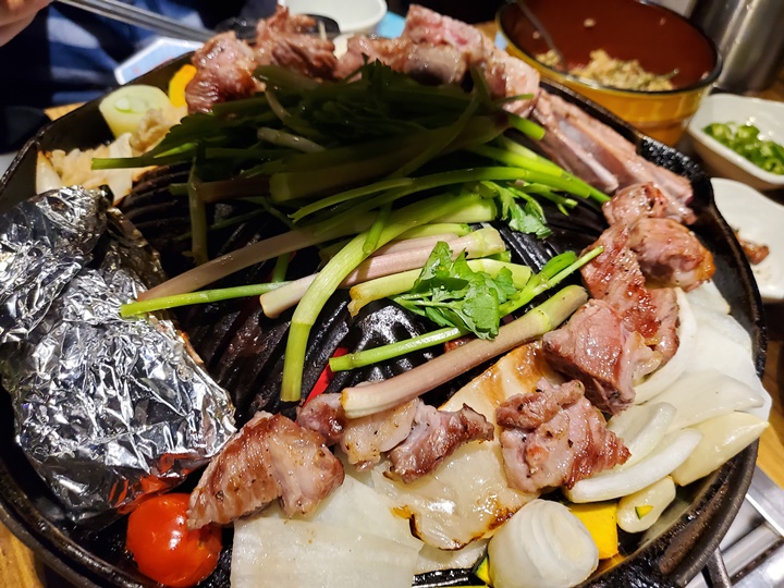 양고기는 직원이 직접 세팅해서 불판에 올린 다음 먹기 좋게 구워준다. 방울토마토, 파, 양파, 마늘, 감자 등 채소가 익으면 고기랑 같이 먹으면 된다. 쿠킹호일 안에 들어있는 것은 새송이버섯이었음 ^^