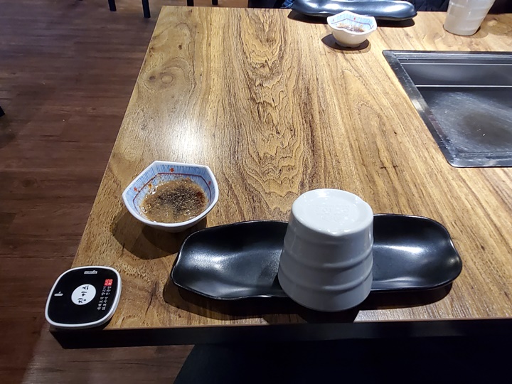 방문명부 작성과 체온 측정을 한 다음 안내받은 자리에 앉았다. 기본세팅도 일사천리로 착착~ 수저, 냅킨, 오프너는 탁자 측면 서랍에 있으니 꺼내서 사용하면 된다. 벨이 있기는 하지만, 굳이 누를 필요가 없는 것이 거의 직원분이 옆에서 상주하고 있다시피 하기 때문에 요청사항은 바로 이야기하면 되어서 편하다.