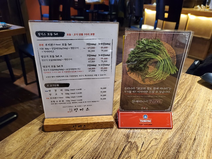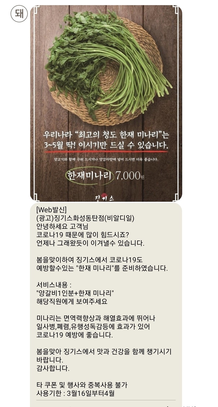 며칠 전 도착한 문자 때문이었다. 징기스에 문자쿠폰을 제시하면 양갈비1인분과 한재 미나리를 서비스로 제공한다니 솔깃하지 않을 수 없었다. 양갈비 1인분에 14,000원이고, 한재 미나리는 7,000원인데~ 이런 쿠폰은 감사히 받고 얼른 먹으러 가야하는 법 :D