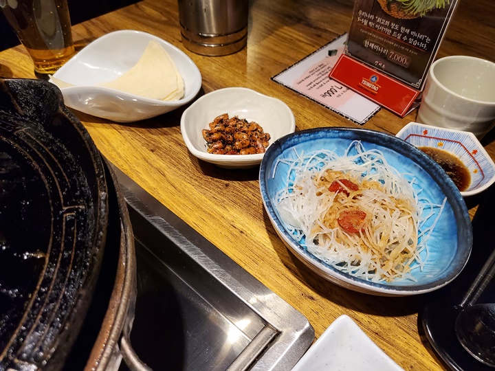 그러나~ 불판에 적당히 굽굽한 미나리랑 양고기 함께 먹으니 얼마나 맛있던지! 불판 위의 다른 구운 채소보다도 미나리와 합이 좋았다.