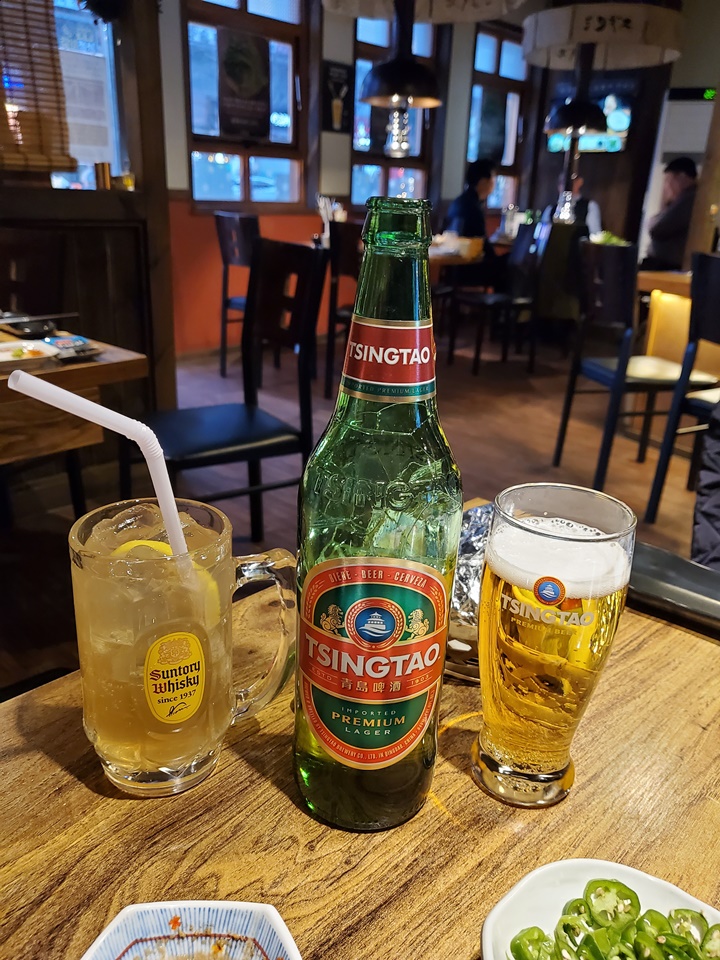 일단 양갈비 2인분과 아지타마고, 칭타오 한 병과 하이볼 한 잔을 주문했다. 양갈비 2인분만 주문했지만, 서비스 쿠폰으로 양갈비 1인분과 미나리 같이 제공되어 총 3대가 나왔다.