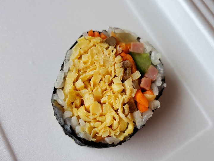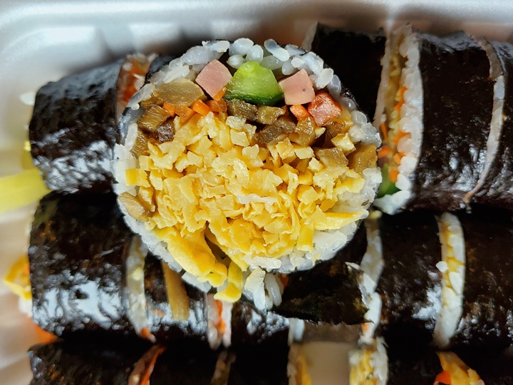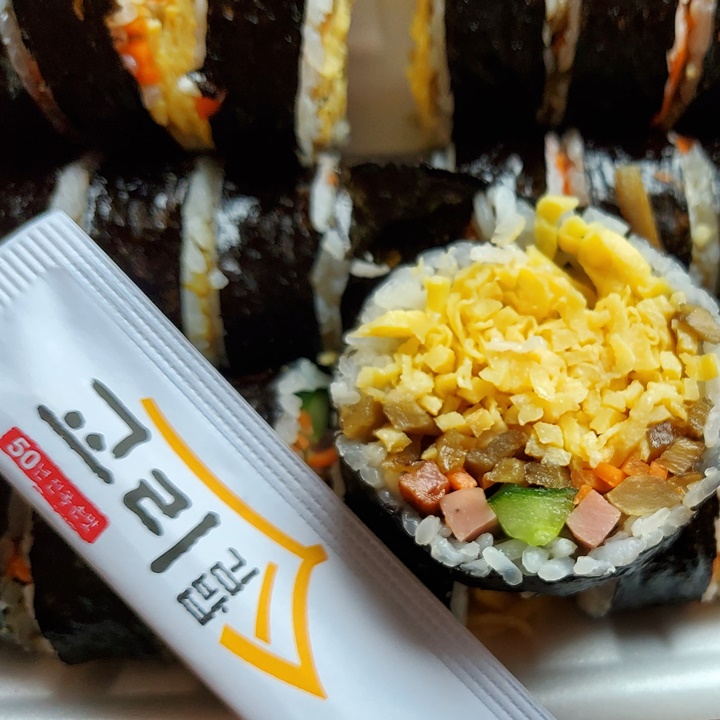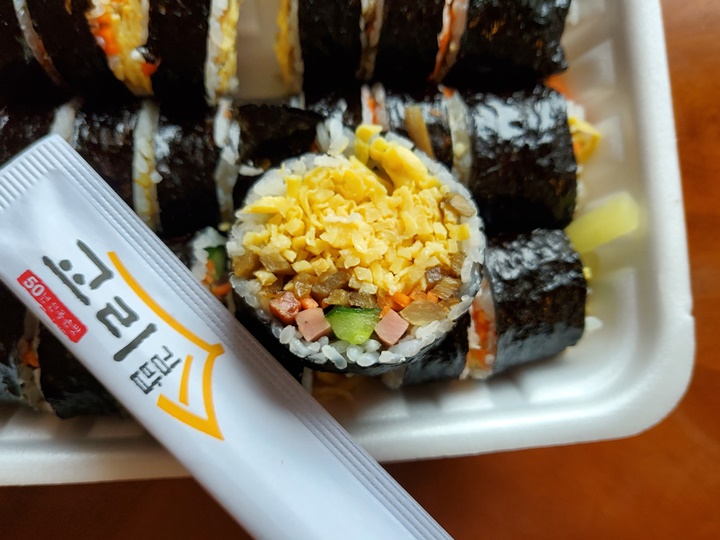 하지만, 맛은 아주 특출 난 것인지 의문스럽기는 했다. 계란이 듬뿍 들어간 특색이 있기는 하지만, 간이 좀 센 편이라 물을 계속 찾게 되는...? 그리고 우리가 받은 김밥만 그런 것인지.... 제대로 커팅이 되어 있지 않아서 끄트머리 부분이 줄줄 풀려 먹기 불편했다. 그래도 먹고 싶었던 김밥이라 한 번쯤은 먹어본 것에 의의를 ^^