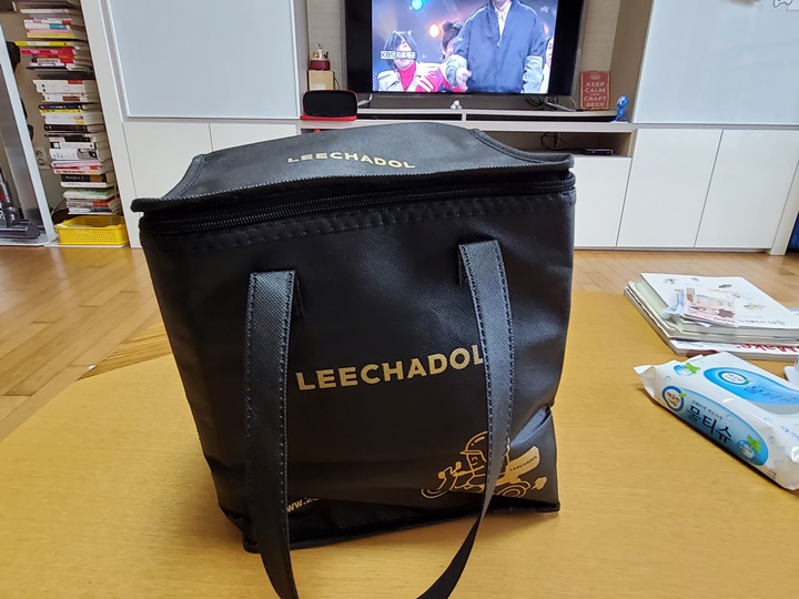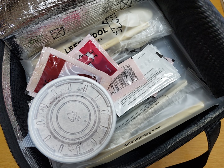 토요일 점심시간대에 주문하면 대부분 배달시간이 60분 이상 걸리는데 그보다는 빨리 도착했던 듯. 주문한 지 50분 정도만에 도착했다. 이차돌 배달 가방이 아주 간지템이다. 차에 음료수나 간식 가지고 다닐 때 유용하게 사용할 것 같은?