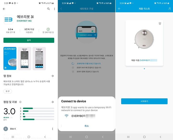 스마트 애플리케이션 에브리봇 3i 앱을 설치해서 제품선택, 연결 후 청소를 시작했다. 청소모드 선택이 가능하고, 매핑 후 금지 영역 설정, 스팟청소, 지도관리, 흡입력 조절, 청소 기록 확인 등이 가능하다.