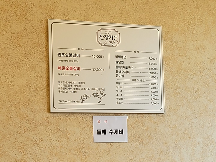 세종 고복저수지 산장가든 메뉴 주메뉴가 돼지갈비이다. 원조숯불갈비는 16,000원 (국내산 돼지 1인분 250g)이고 매운숯불갈비는 17,000원 (국내산 돼지 1인분 250g)이다. 주메뉴를 먼저 주문하고 식사메뉴는 나중에 주문하라고 한다. 한꺼번에 나오는 게 좋은데, 나중에 따로 주문해도 빨리 나옴~!