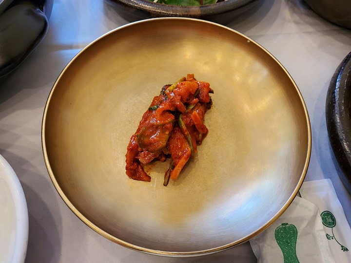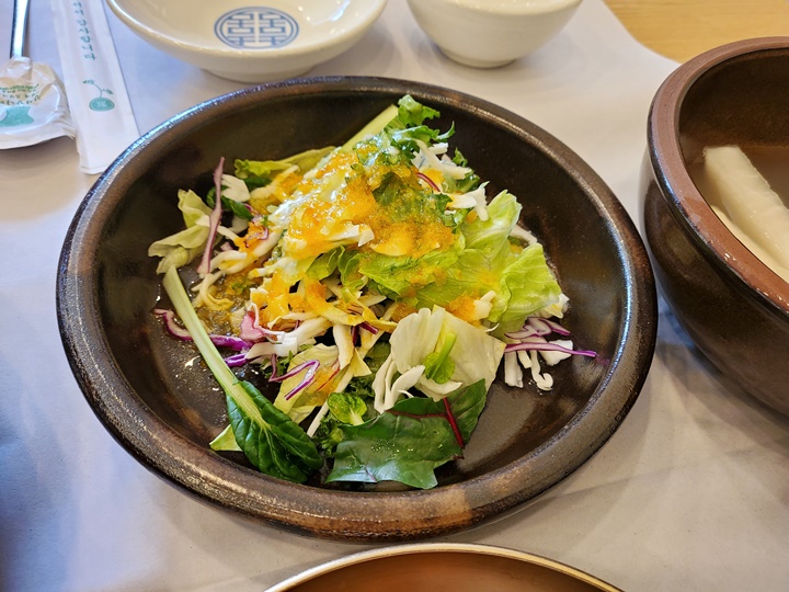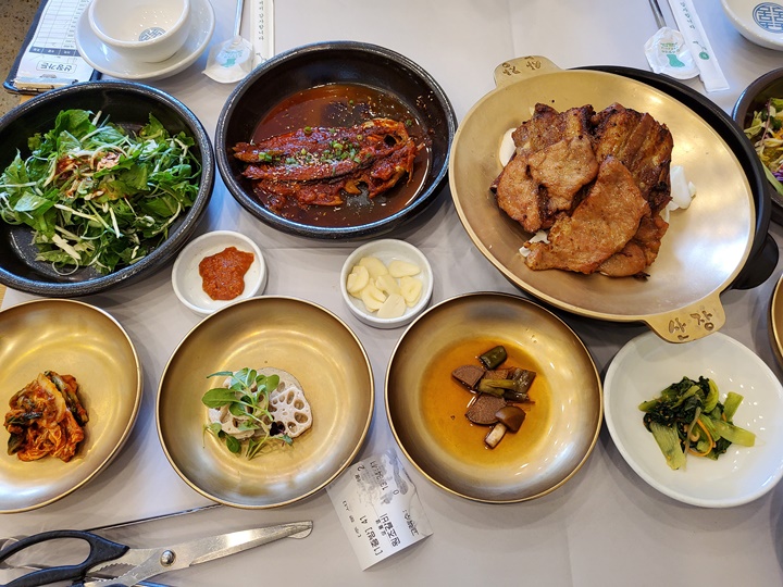산장가든 기본상차림이 훌륭한데, 돼지갈비를 못먹는 남편과 함께 산장가든에 간 이유도 바로 반찬 때문이었다. 우선 남편이 매우 좋아하는 코다리가 나온다. 샐러드, 동치미부터 김치 등등 반찬이 깔끔하게 나오는데 그릇도 한몫하는 듯! 메인인 돼지갈비는 반찬이 세팅되고 5분쯤 후에 나왔다.