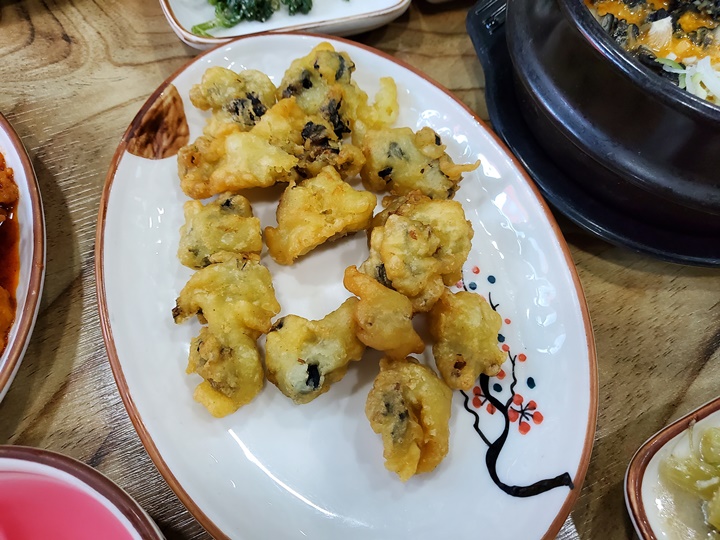 기본찬은 6가지가 나오는데 계절이나 식당 사정에 따라 종류나 가짓수가 조금씩 달라진다고 한다. 2021년 6월 하순 방문 기준으로는 노각무침이 정말 맛있었다. 손님들이 리필하는 반찬이 거의 일치했는데 우리도 노각무침이랑 어리굴젓이 최고 최고!