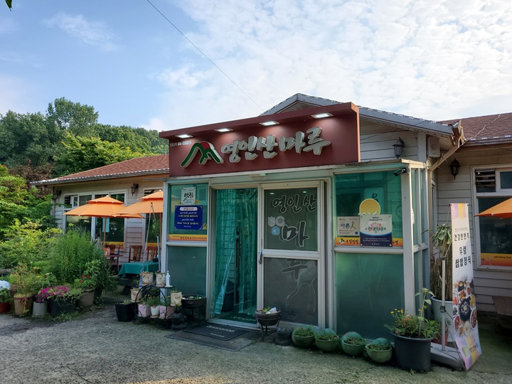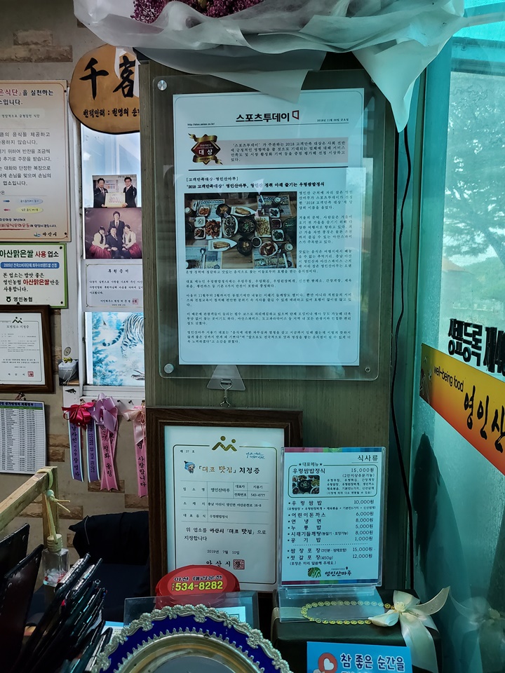 나오면서 보니 영인산마루 2호점도 있다길래 검색해봤다. 천안 갤러리아 센터시티점에 입점해 있다고 하는데 우렁쌈밥정식 가격이 조금 차이 났다. 본점은 15,000원인데 2호점은 14,000원이다. 왜 그런가 하고 메뉴 구성을 보니 우렁무침 우렁튀김 우렁쌈장 제육볶음 밥 국 쌈채 반찬 3종에 14,000원이었다. 본점에 나오는 게장, 생선까스는 포함되지 않는 모양인데 상차림은 2호점이 더 깔끔해 보였다.