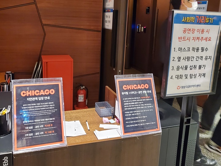 뮤지컬 시카고 공연시간은 중간에 20분간 인터미션 포함 총 150분으로 7시 30분에 시작해서 딱 10시에 끝났다. (7시 30분 공연시작-8시 40분쯤 쉬는 시간 20분- 10시 공연 끝) 또한 지연 입장객은 공연 시작 약 8분 후, 약 19분 후 입장이 가능하다.