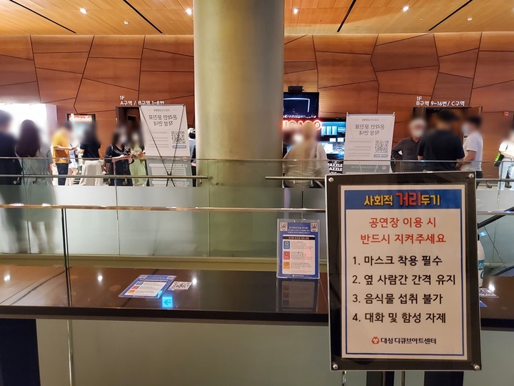 사회적 거리두기 시행으로 공연장 내외에서 반드시 지켜야 할 사항이 있다. 마스크 착용은 필수, 옆 사람간 간격 유지 (빈자리가 있는데 착석 금지이다. 셀카 조차도 사진 촬영이 불가하여 좌석 사진도 찍지 못했다 ㅠㅠ), 음식물 섭취 불가, 대화 및 함성은 자제하고 박수로 짝짝짝 호응하기!!!