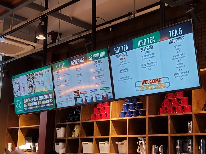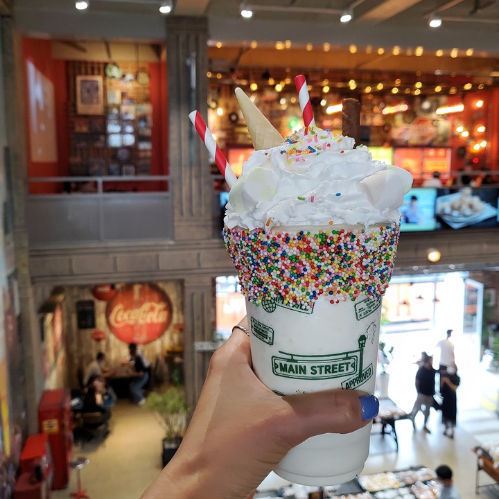 평택 핫플 메인스트리트 대표 메뉴로 단연 밀크셰이크를 꼽는데 이건 패밀리존과 빵, 음료 계산대 사이에 뉴욕 스트리트 푸드 코너에서 주문해야 한다. 키오스크로 주문, 결제하면서 휴대전화 번호를 입력하면 문자로 메뉴 나왔다고 알려준다. 알림 문자 받고도 픽업하러 오지 않으면 안내방송도 한다. 밀크쉐이크 녹으니 언능 가져가라고 ^^ㅋ