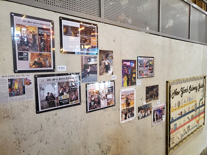 우리가 앉은자리에서 바라본 1층, 맞은편은 미국의 전형적인 펍 느낌이 나는 팝스트리트이다. 밤에 조명이 야시꾸리 예뻐진다고 하니 썸남썸녀 데이트 장소로 추천드림 :D