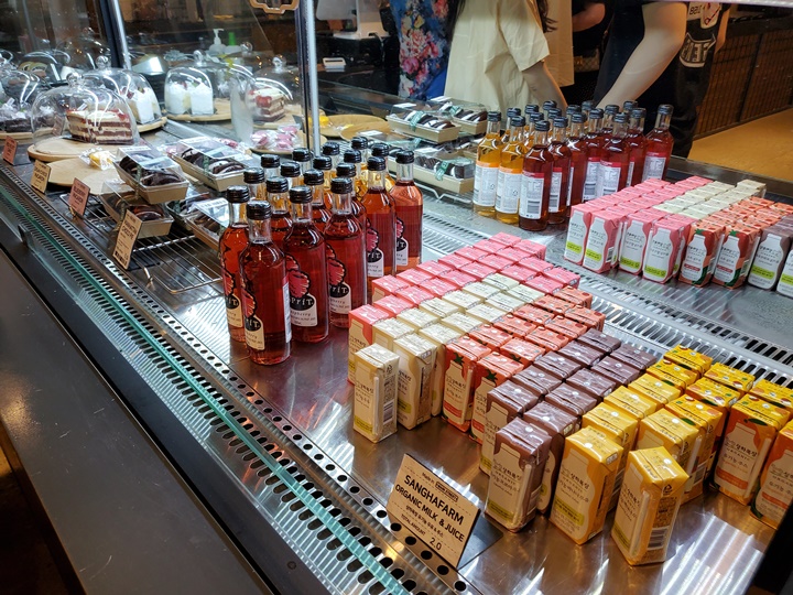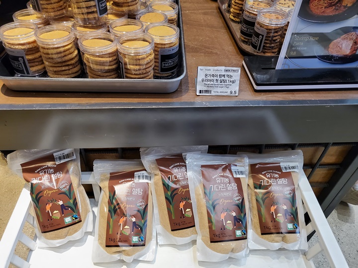 계산 줄 동선을 따라 베이커리가 배치되어 있어서 기다리다가 트레이에 하나 둘 담는 경우도 많아 보였다. 아이들 마실 멸균우유와 마카롱도 있어서 좋다.