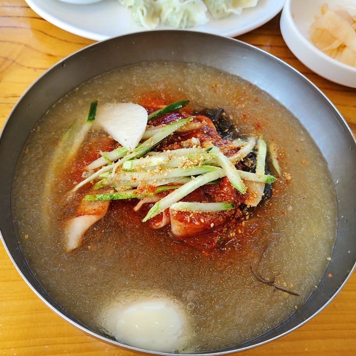 비빔냉면은 맵기도 하고 비냉을 먹는 경우는 거의 없어서 이번에도 물냉면만 주문했다. 물냉면도 꽤 매운데, 맵찔이라 양념을 따로 달라고 할까 고민하다가 모름지기 청학동 칡냉면의 중독성은 이 양념에서 비롯된 바, 그냥 먹기로 하고 물냉면 보통과 대 각 한 그릇씩과 물만두를 주문했다. 회냉면은 겨울 계절메뉴라 몇 년이 되도록 한 번도 못 먹고 있다. 그 말인즉슨 여기엔 무더운 여름에만 찾게 된다는 의미이기도 하다.